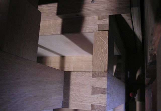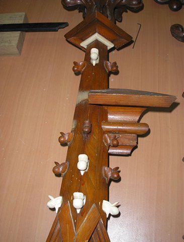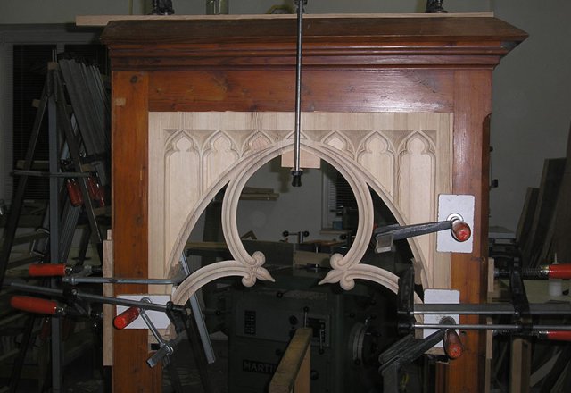 Das historische Gehäuse wurde einer sehr gründlichen Restaurierung in unserer Werkstätte unterzogen. Die seitlichen Schleierbretter wurden den vorhandenen angepasst, fehlende Dächer wurden ergänzt. Hinter dem historischen Orgelwerk wurde ein neues Gehäuse für das Pedalwerk gebaut. Hier fand auch der Zugang ins Orgelwerk Platz.