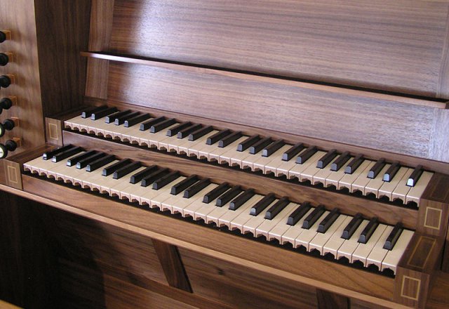 Die Spieltafel wurde in Nussholz gefertigt. Eine Besonderheit sind die leicht schräg gestellten Registerblenden, sodass die Züge ergonomisch leichter zu bedienen sind.