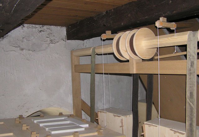 Zwei Keilbälge im dahinterliegenden Turm lassen sich mit Motor und Handzug per Gurt bedienen.